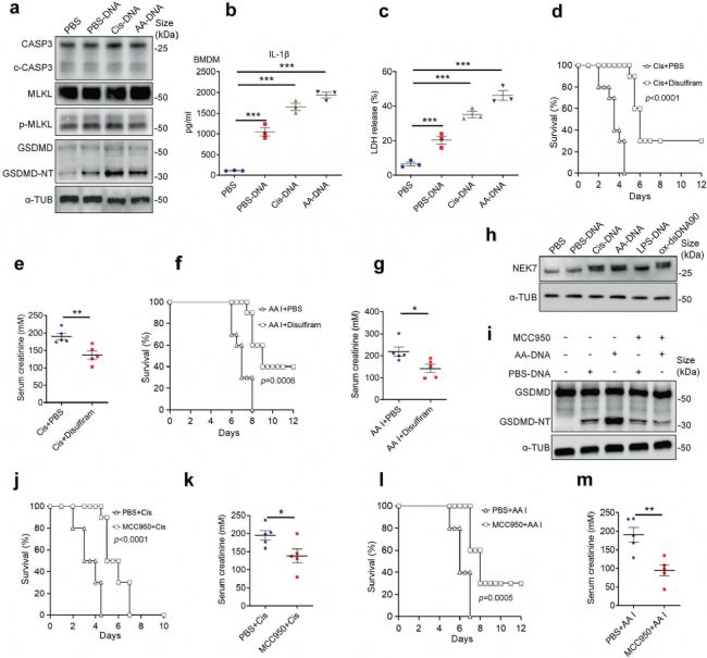 研究人員進一步研究了氧化自身DNA釋放是否促進順鉑誘導(dǎo)的AKI中的焦亡。他們發(fā)現(xiàn),自身DNA處理的BMDMs中N末端孔形成蛋白GSDMD片段(GSDMD-NT)的水平顯著升高,這是焦亡的關(guān)鍵執(zhí)行者。同時,IL-1β和LDH的釋放也升高。有趣的是,氧化自身DNA(Cis-DNA和AA-DNA)比PBS-DNA在誘導(dǎo)焦亡方面表現(xiàn)出更強的能力。在體內(nèi)實驗中,預(yù)先用GSDMD抑制劑二硫化鉬處理的AKI小鼠的生存率得到改善,其效果與DNase I治療組相當(dāng)。此外,NEK7的表達水平在各種氧化自身DNA和氧化dsDNA90(陽性對照)條件下均升高。NLRP3信號通路抑制劑MCC950顯著降低了氧化自身DNA處理后GSDMD的裂解,并且MCC950治療也改善了用腎毒性藥物治療的小鼠的生存率和腎小管損傷。因此,NLRP3炎癥小體在氧化自身DNA促進AKI進展中起著至關(guān)重要的作用。