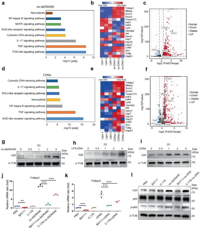 為了尋找能夠限制氧化自身DNA引起的過度炎癥的分子,研究人員使用了A20flox/flox小鼠模型(由賽業(yè)生物提供)構(gòu)建了A20myel-KO小鼠,并對用氧化dsDNA90處理的BMDMs進行了RNA測序。KEGG通路分析顯示,氧化DNA處理組中細胞質(zhì)DNA傳感通路、NOD樣受體信號通路和NF-κB信號通路被高度富集。進一步研究發(fā)現(xiàn),氧化DNA刺激導(dǎo)致Tnfaip3(編碼A20)的表達顯著上調(diào)。此外,用cyclic dinucleotides (CDNs)刺激BMDMs也觀察到Tnfaip3的顯著上調(diào),并且KEGG通路分析也顯示CDNs處理組中NOD樣受體信號通路和NF-κB信號通路被高度富集。同時,A20myel-KO小鼠的巨噬細胞對氧化自DNA刺激更敏感,STING信號通路相關(guān)蛋白的表達水平升高。這些數(shù)據(jù)表明,STING信號通路和NLRP3炎癥小體之間可能存在潛在的關(guān)聯(lián);谝陨贤茢,研究人員發(fā)現(xiàn)A20的表達水平隨時間增加,并且A20的表達增加與NF-κB或STING信號通路的激活有關(guān),它可以保護腎臟免受炎癥和組織損傷。