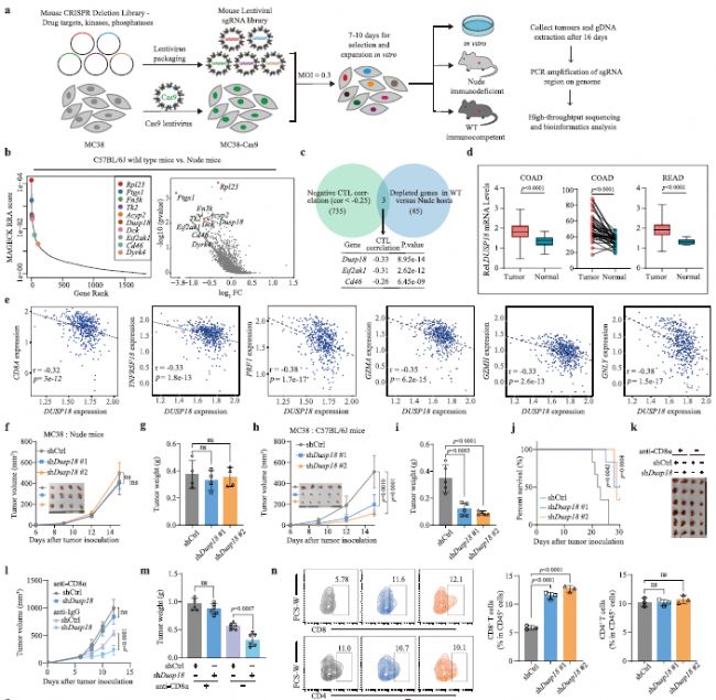 研究人員通過sgRNA文庫(kù)篩選,并尋找與細(xì)胞毒性T淋巴細(xì)胞(CTL)評(píng)分負(fù)相關(guān)的交集基因,其中最值得注意的是Dusp18。與正常結(jié)直腸組織相比,CRC樣本中DUSP18 mRNA的表達(dá)水平也較高。在DUSP18 mRNA低表達(dá)的CRC患者中,CTL評(píng)分高的患者生存率更高,而DUSP18 mRNA高表達(dá)且CTL評(píng)分高的患者生存率更低。為了確定抑制Dusp18是否會(huì)影響T細(xì)胞介導(dǎo)的抗腫瘤功能,研究人員在MC38 CRC細(xì)胞和表達(dá)卵清蛋白(OVA)的B16黑色素瘤(B16-OVA)細(xì)胞中進(jìn)行shRNA介導(dǎo)的Dusp18抑制。敲低Dusp18并不影響腫瘤細(xì)胞在體外的增殖或腫瘤在免疫缺陷裸鼠體內(nèi)的生長(zhǎng)。然而,抑制Dusp18確實(shí)會(huì)影響免疫功能正常小鼠中腫瘤生長(zhǎng)并延長(zhǎng)其生存時(shí)間,而清除CD8+ T細(xì)胞則可以消除敲低Dusp18引起的腫瘤生長(zhǎng)劣勢(shì)。因此,上述結(jié)果表明,DUSP18通過CD8+ T細(xì)胞依賴的方式來促進(jìn)CRC的免疫逃避。