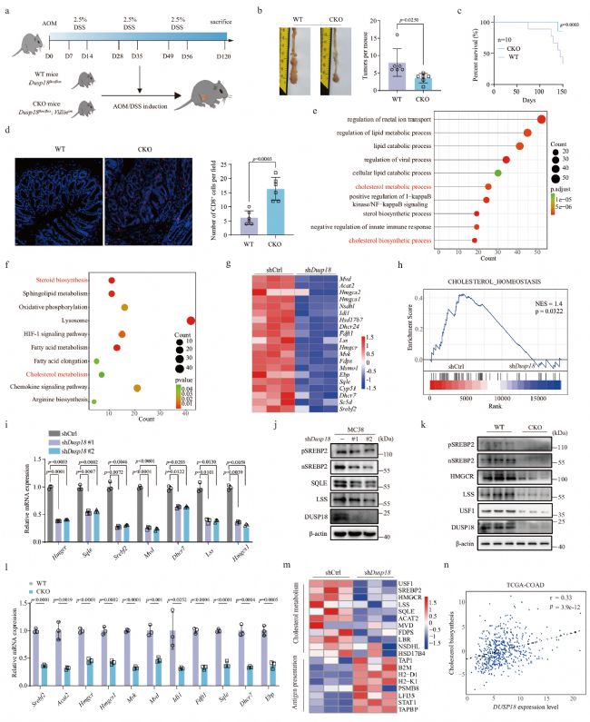 為了確定抑制DUSP18表達(dá)抗腫瘤免疫的分子機(jī)制,研究人員對(duì)shCtrl和shDusp18 MC38細(xì)胞進(jìn)行RNA-seq分析。GO和KEGG分析顯示,shDusp18細(xì)胞中下調(diào)的基因主要是參與膽固醇生物合成及其下游代謝途徑;蚣患治觯℅SEA)也顯示,與膽固醇穩(wěn)態(tài)相關(guān)的基因在對(duì)照細(xì)胞中呈正富集。隨后通過進(jìn)一步證實(shí),在shDusp18 MC38細(xì)胞和CKO(腸道上皮特異性DUSP18缺失的小鼠)腫瘤組織中(由賽業(yè)生物構(gòu)建的小鼠),膽固醇生物合成基因的mRNA表達(dá)和蛋白水平下降。此外,研究人員還對(duì)shCtrl和shDUSP18人CRC HCT116細(xì)胞進(jìn)行RNA-seq分析,以驗(yàn)證在小鼠MC38細(xì)胞中的結(jié)果。GO、KEGG和GSEA分析均顯示,抑制DUSP18可顯著降低膽固醇生物合成途徑相關(guān)基因的表達(dá)?傊,上述研究結(jié)果都支持DUSP18通過調(diào)節(jié)細(xì)胞膽固醇的生物合成來調(diào)控腫瘤相關(guān)的免疫環(huán)境。