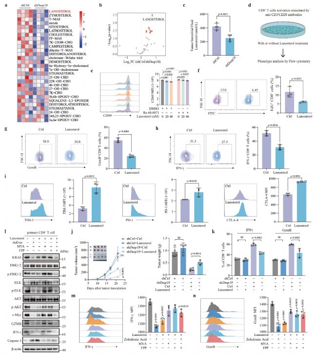 圖3 Dusp18驅(qū)動(dòng)的TME中的羊毛甾醇促進(jìn)CD8+T細(xì)胞失活