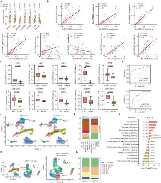 研究人員還進(jìn)一步利用CRC臨床樣本驗(yàn)證了本文發(fā)現(xiàn)的信號(hào)軸在腫瘤=組織中高度上調(diào),也基于單細(xì)胞數(shù)據(jù)分析發(fā)現(xiàn)DUSP18的表達(dá)與腫瘤浸潤(rùn)C(jī)D8 T細(xì)胞功能之間的相關(guān)性。
