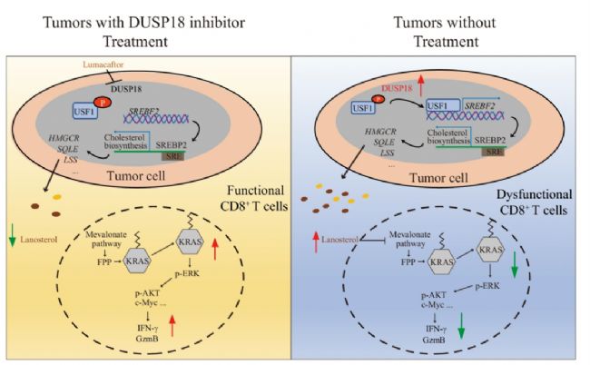 該研究結(jié)直腸癌免疫逃逸這一現(xiàn)象為切入點(diǎn),揭示了DUSP18作為新的調(diào)控膽固醇生物合成的因子,來促進(jìn)腫瘤微環(huán)境中羊毛甾醇的積累進(jìn)而限制T細(xì)胞的活化,最終促進(jìn)CRC的免疫逃逸。
