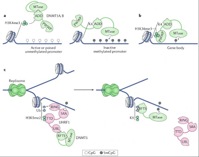 c.DNA甲基化的維持機(jī)制。左圖:E3泛素連接酶UHRF1通過(guò)其SRA域(識(shí)別半甲基化CpG位點(diǎn))和TTD域(結(jié)合H3K9me2)被招募至復(fù)制中的DNA。UHRF1的RING域泛素化修飾組蛋白H3尾部(Ub)。DNMT1的復(fù)制焦點(diǎn)靶向序列(RFTS)折疊至MTase域,抑制其催化活性。UHRF1通過(guò)其泛素樣(UBL)域與DNMT1的RFTS互作,招募DNMT1。右圖:當(dāng)RFTS結(jié)合泛素化H3尾部時(shí),DNMT1的自抑制解除,從而維持CpG位點(diǎn)的對(duì)稱性甲基化。