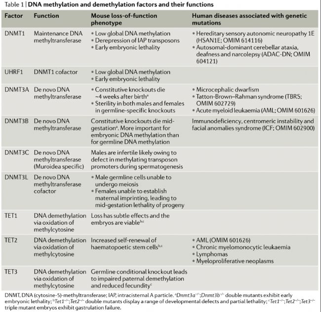 表1:DNA甲基化和去甲基化因子及其功能