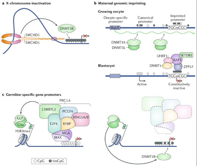 X-chromosome inactivation(X染色體失活):在雌性哺乳動(dòng)物中,每個(gè)細(xì)胞中的一條X染色體會(huì)被隨機(jī)沉默,這一過(guò)程由非編碼RNA X- inactive specific transcript(XIST)在順式(in cis)中發(fā)揮作用。在X染色體失活過(guò)程中,DNA甲基化出現(xiàn)在相對(duì)較晚的階段,作為基因沉默后的最終鎖定機(jī)制。在小鼠中,X連鎖CGI啟動(dòng)子的沉默主要依賴于DNMT3B,而SMCHD1在部分X連鎖CGI中也發(fā)揮重要作用,但其在人類(lèi)中與DNA甲基化的聯(lián)系尚未明確。