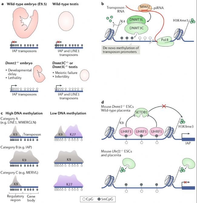 基因組防御轉(zhuǎn)座元件被認(rèn)為是DNA甲基化進(jìn)化的驅(qū)動(dòng)力之一,哺乳動(dòng)物基因組中DNA甲基化的主要靶標(biāo)不是基因而是轉(zhuǎn)座元件,尤其是逆轉(zhuǎn)錄轉(zhuǎn)座元件。小鼠和人類(lèi)基因組中有數(shù)百萬(wàn)個(gè)逆轉(zhuǎn)錄轉(zhuǎn)座元件拷貝,占據(jù)了大約一半的基因組空間。在小鼠Dnmt1敲除胚胎中,內(nèi)源性A粒子(IAP)逆轉(zhuǎn)錄轉(zhuǎn)座元件被大量去抑制,導(dǎo)致嚴(yán)重的發(fā)育缺陷和胚胎致死(圖3a)。