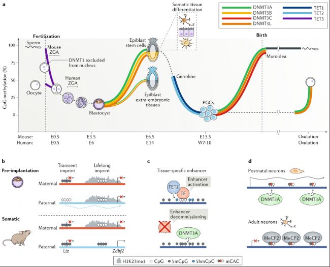 a.胚胎與生殖細(xì)胞系DNA甲基化的去除與重建。甲基胞嘧啶雙加氧酶TET3在受精卵中激活,催化羥甲基化并介導(dǎo)主動(dòng)DNA去甲基化。隨后通過(guò)被動(dòng)去甲基化(虛線表示),DNA甲基化水平在囊胚階段降至最低;囊胚植入后,由DNMT3A和DNMT3B介導(dǎo)的de novo甲基化重新建立甲基化模式。DNMT3L在此階段雖表達(dá),但對(duì)胚胎基因組甲基化非絕對(duì)必需。在胚胎外組織中,DNMT3A、DNMT3B和DNMT3L表達(dá)量低于胚胎本體,導(dǎo)致相對(duì)低甲基化狀態(tài)。植入后,外胚層中部分干細(xì)胞分化為生殖細(xì)胞系細(xì)胞,經(jīng)歷兩波去甲基化:被動(dòng)去甲基化及TET1/TET2介導(dǎo)的主動(dòng)去甲基化。雄配子在出生前通過(guò)DNMT3A和DNMT3L(小鼠等嚙齒類(lèi)還需DNMT3C)實(shí)現(xiàn)高甲基化;雌配子在減數(shù)分裂后、排卵前通過(guò)DNMT3A和DNMT3L(人類(lèi)可能僅需DNMT3A)完成甲基化。