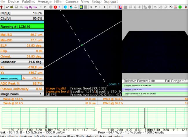 根據(jù)光束強度調(diào)整曝光時間,確保峰值ADC低于90%。觀察光束,可以看到光斑情況,當如下圖,如果軟件判定測量數(shù)據(jù)無效或存在錯誤,相關數(shù)據(jù)的字體將顯示為橙色。