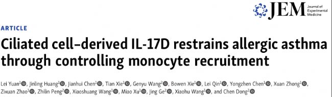 Yuan L, Huang J, Chen J, Xie T, Wang G, Xie B, Qin L, Chen Y, Zhong X, Zhao Z, Peng Z, Wang X, Xu M, Ge J, Wang X, Dong C. Ciliated cell-derived IL-17D restrains allergic asthma through controlling monocyte recruitment. J Exp Med. 2025 Oct 6;222(10) doi: 10.1084/jem.20242328.