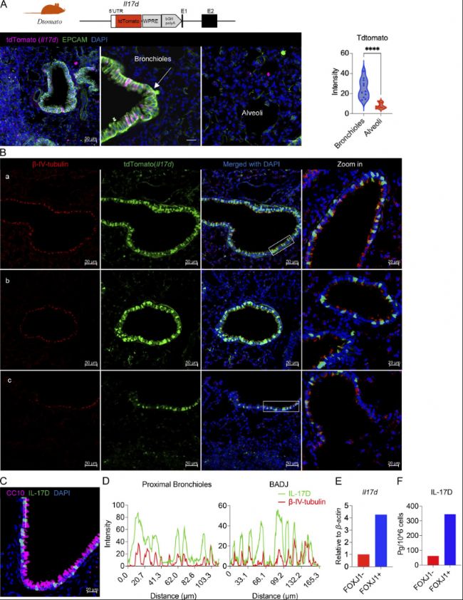 (A)上圖:Il17d-tdTomato報告基因小鼠(Dtomato)的靶向策略。左下:肺組織免疫熒光染色及細支氣管與肺泡空間的放大圖像,tdTomato(紅)、EPCAM(綠)、DAPI(藍)。右下:細支氣管(11個視野)和肺泡(12個視野)中tdTomato的平均熒光強度。