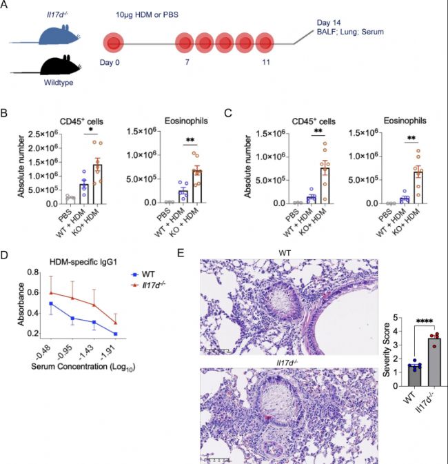 (D) 血清中HDM特異性IgG1水平(縱軸為450 nm吸光度,橫軸為血清稀釋梯度;WT組n=3;Il17d-/-組n=4)。