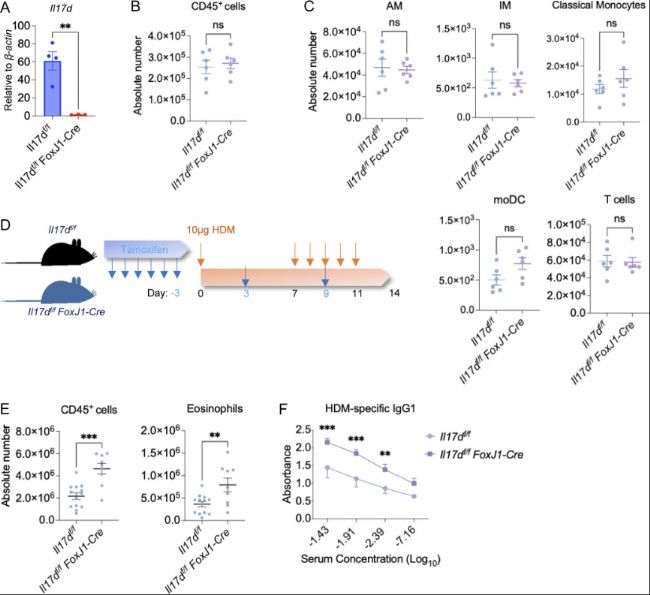 通過條件性敲除Foxj1tm1.1(cre/ERT2/GFP)小鼠中的Il17d,研究者發(fā)現(xiàn),僅在纖毛細胞中敲除Il17d就足以導致HDM誘導的過敏反應加劇,表現(xiàn)為肺內(nèi)總免疫細胞和嗜酸性粒細胞浸潤增加,血清IgG1升高。證明纖毛細胞是IL-17D的功能性來源。
