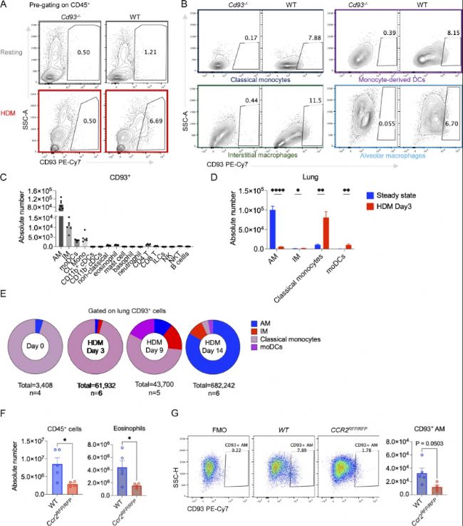 (G)左圖:HDM模型第14天WT和Ccr2RFP/RFP小鼠AMs的CD93表面染色(FMO為未染色對照);右圖:兩組小鼠肺中CD93+ AMs數(shù)量。