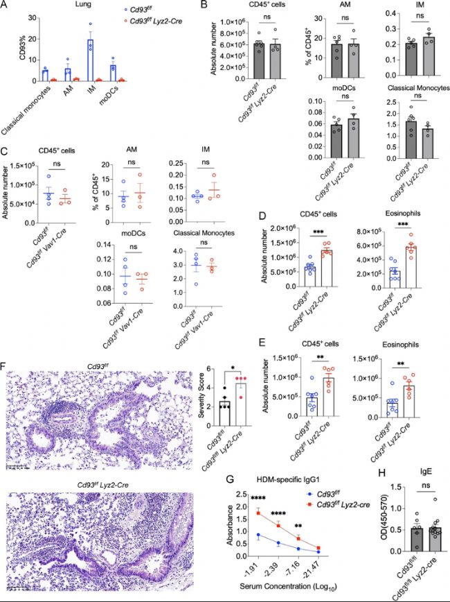 在HDM模型中,Cd93條件性敲除小鼠(Cd93f/f×Lyz2-Cre)表現(xiàn)出更嚴重的過敏反應,包括肺部和BALF中免疫細胞浸潤增加,以及血清中HDM特異性IgG1水平升高。這表明CD93在單核細胞和巨噬細胞中對過敏性哮喘具有保護作用。