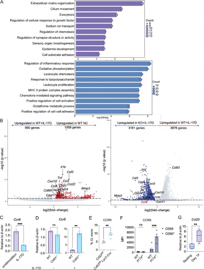 RNA測序(Smart-seq2):對WT和Cd93-/-單核細胞進行RNA測序(scRNA-seq),分析IL-17D調(diào)控的基因通路,發(fā)現(xiàn)CCR6等遷移相關基因下調(diào)。
