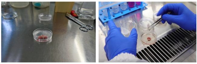 (1)在60mm細(xì)胞培養(yǎng)皿(abs7005)里用2-3ml原代培養(yǎng)緩沖液 B浸泡。用原代培養(yǎng)緩沖液 B清洗三次(每次更換培養(yǎng)皿)后剪碎,剪成大約1-3mm3的組織塊,轉(zhuǎn)移至15ml離心管。