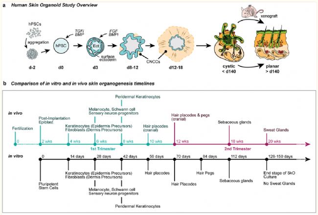 原理:hiPSC(abs90290)經(jīng)階段性誘導(dǎo)(TGFβ/FGF通路調(diào)控)獲得含表皮真皮毛囊/神經(jīng)成分的皮膚類器官。