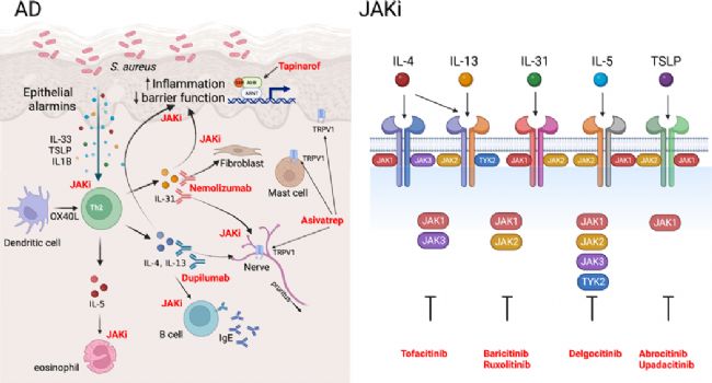 JAKi:抑制JAK-STAT信號通路激活,抑制炎癥因子的產(chǎn)生和作用,從而減輕 AD 的炎癥反應(yīng)和瘙癢癥狀(abs820469等)。