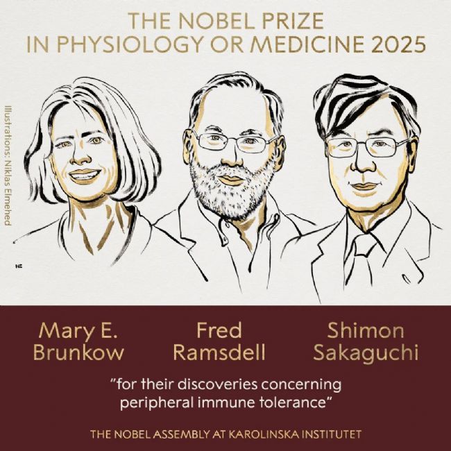 2025年諾貝爾生理學(xué)或醫(yī)學(xué)獎授予美國西雅圖系統(tǒng)生物學(xué)研究所的Mary E. Brunkow(瑪麗·布倫科)、美國索諾瑪生物治療公司的Fred Ramsdell(弗雷德·拉姆斯德爾)、日本大阪大學(xué)的Shimon Sakaguchi(坂口志文),以表彰他們在外周免疫耐受領(lǐng)域的發(fā)現(xiàn)。