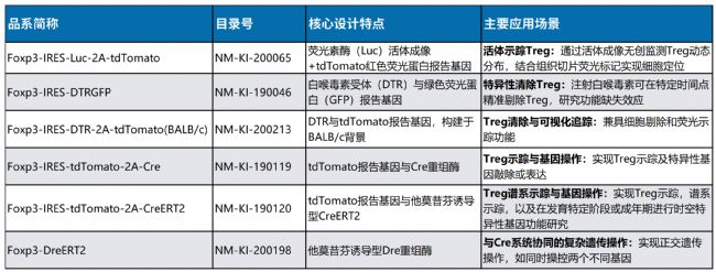 南模生物開發(fā)的Foxp3系列基因編輯小鼠模型,正是將這一諾獎級發(fā)現(xiàn)轉(zhuǎn)化為實(shí)際研究工具的最佳例證。以下表格匯總了南模生物基于Foxp3基因構(gòu)建的系列工具鼠模型及其核心應(yīng)用: