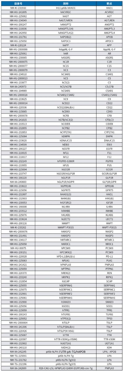 南模生物針對小核酸藥物研究的常見靶點自主研發(fā)了多種人源化動物模型,助力小核酸藥物的臨床前研究,模型信息詳見下表,歡迎咨詢。