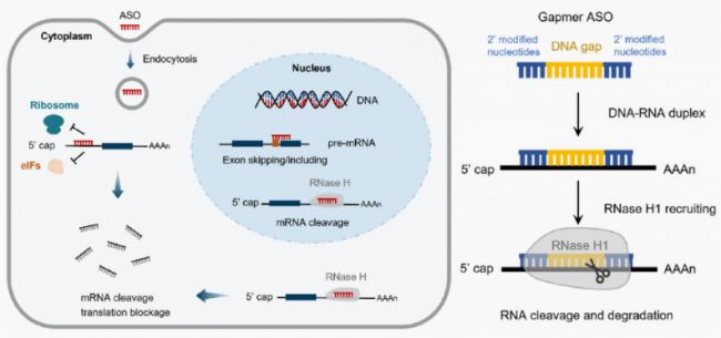 反義寡核苷酸堪稱 mRNA 的“封鎖者”。這類單鏈核酸分子專為互補結合靶標 mRNA 設計,像定制化拼圖般嚴絲合縫嵌入,直接阻斷翻譯起始或引發(fā) RNase H 介導的 mRNA 降解,從源頭掐斷致病蛋白合成鏈路。在脊髓性肌萎縮癥治療里,ASO 精準綁定 SMN2 基因轉錄本,修正剪接異常,讓功能性蛋白重獲表達,為絕癥患者點燃希望之光。