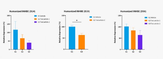 圖6. qPCR檢測肝臟中INHBE的表達。hINHBE小鼠被隨機分為 3 組,分別接受測試藥物(合作者提供)的治療。結果顯示,測試藥物能有效降低肝臟中INHBE的表達。