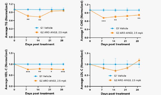 圖8. 檢測給藥前后hANGPT3小鼠的血脂水平。將hANGPT3小鼠隨機分為兩組(n=8),對小鼠施用ARO-ANG3(一種靶向ANGPTL3的核酸藥物),結果顯示,ARO-ANG3處理組TG,T-CHO,HDL-C水平顯著降低。