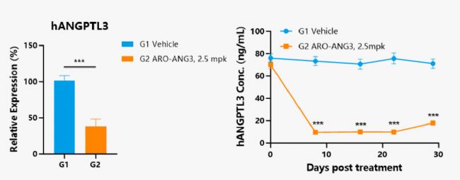 圖9. qPCR和ELISA檢測給藥前后hANGPT3小鼠的ANGPT3 mRNA和蛋白水平 。結果顯示,ARO-ANG3處理組的人 ANGPT3表達顯著降低。