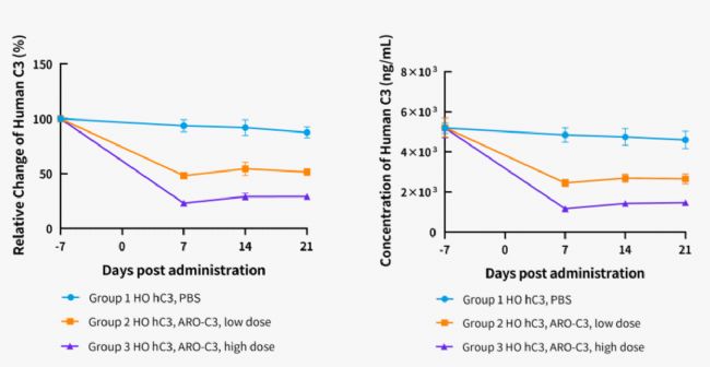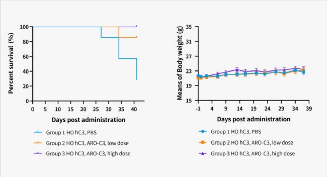 圖10 ELISA檢測血清hC3水平。結果顯示,ARO-C3處理組hC3小鼠的血清human C3水平顯著降低。