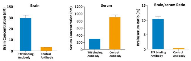 圖12. hTFR1小鼠中TFR1靶向治療藥物的體內評價。給藥18h后采集腦組織和血清,對抗體的腦濃度、血清濃度及腦血清比進行定量分析。如圖所示,TFR1表現出更高的血清清除率和增強的腦暴露水平。