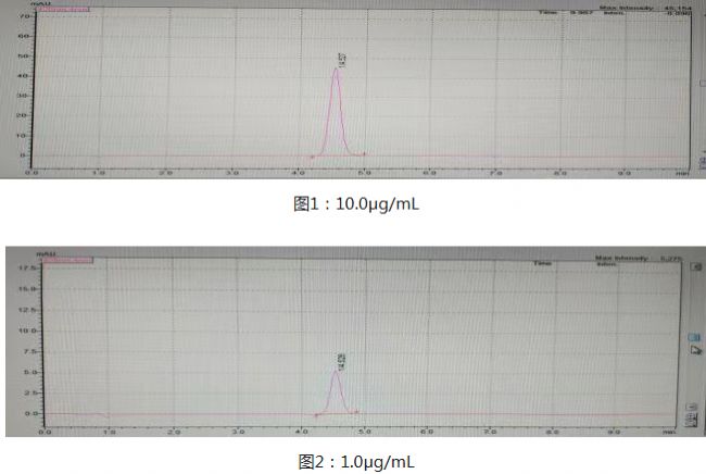 9. 根據(jù)標準配制1.0μg/mL、2.0μg/mL、5.0μg/mL、10.0μg/mL、20.0μg/mL、50.0μg/mL的標準系列溶液進行檢測。