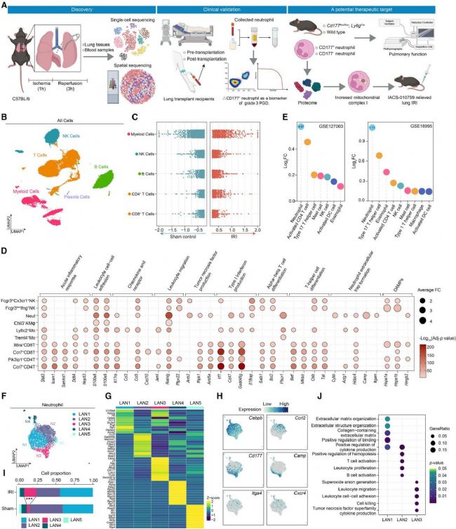 原發(fā)性移植物功能障礙(PGD)是肺移植后早期發(fā)病率和死亡率的主要原因,中性粒細(xì)胞在其炎癥病理中起著核心作用。文章利用scRNA-seq和Stereo-seq等技術(shù),研究肺缺血再灌注損傷(IRI)模型中的中性粒細(xì)胞亞型。研究發(fā)現(xiàn)CD177+中性粒細(xì)胞是一個(gè)活化的亞群,顯著促進(jìn)了肺損傷,并作為預(yù)測(cè)人類肺移植受者中重度PGD的早期生物標(biāo)志物。CD177+中性粒細(xì)胞表現(xiàn)出增強(qiáng)的氧化磷酸化和增加的線粒體復(fù)合體I活性,推動(dòng)炎癥反應(yīng)和中性粒細(xì)胞外陷阱的形成。通過(guò)使用復(fù)合體I抑制劑IACS-010759靶向線粒體功能,可以減少CD177+中性粒細(xì)胞的活化,并在小鼠IRI模型和大鼠左肺移植模型中減輕肺損傷。這些發(fā)現(xiàn)為CD177+中性粒細(xì)胞驅(qū)動(dòng)的肺IRI炎癥提供了全面的圖景,并強(qiáng)調(diào)了其在未來(lái)早期診斷和治療干預(yù)中的潛在價(jià)值。