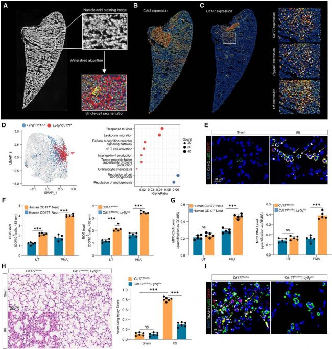 為闡明Cd177+中性粒細(xì)胞的作用,采用Stereo-seq技術(shù)來(lái)驗(yàn)證scRNA-seq。利用分水嶺算法對(duì)核酸染色圖像進(jìn)行單細(xì)胞分割,得到了細(xì)胞的空間分布(圖2A)。接著,在免疫細(xì)胞浸潤(rùn)區(qū)域發(fā)現(xiàn)Cd177轉(zhuǎn)錄本水平升高,并且特定顆;颍↙tf)和模式識(shí)別蛋白(Pglyrp1)的表達(dá)也有所增加(圖2B-C)。進(jìn)一步分析了Cd177+和Cd177−中性粒細(xì)胞,與scRNA-seq中的LAN3一致,Cd177+中性粒細(xì)胞與急性反應(yīng)以及白細(xì)胞介素1和腫瘤壞死因子α產(chǎn)生相關(guān)的轉(zhuǎn)錄本富集,并且在受損的IRI肺部區(qū)域,瓜氨酸化組蛋白H3(Cit-H3)、CD177和Ly6G共定位,表明Cd177+中性粒細(xì)胞是一個(gè)功能上被激活的群體(圖2D-E)。為了系統(tǒng)地研究CD177+中性粒細(xì)胞的影響,研究人員生成了Cd177flox/flox;Ly6gCre小鼠,這種小鼠的中性粒細(xì)胞中特異性地缺失了Cd177基因。體外實(shí)驗(yàn)顯示,人類和小鼠的CD177缺失中性粒細(xì)胞均表現(xiàn)出活性氧(ROS)產(chǎn)生的減少,并且在形成中性粒細(xì)胞外陷阱(NET)方面效率較低,表現(xiàn)為雙鏈DNA(dsDNA)產(chǎn)生量減少(圖2F-G)。在肺門(mén)阻斷肺IRI模型中,Cd177flox/flox;Ly6gCre小鼠的左肺顯示出最小的損傷,保持了結(jié)構(gòu)完整性,且缺乏肺泡水腫或透明膜形成,NETs的浸潤(rùn)幾乎不存在(圖2H-I)。這些結(jié)果表明,Cd177+中性粒細(xì)胞在肺IRI發(fā)病機(jī)制中起重要作用,而Cd177基因缺失可以有效減輕肺損傷并保留功能。