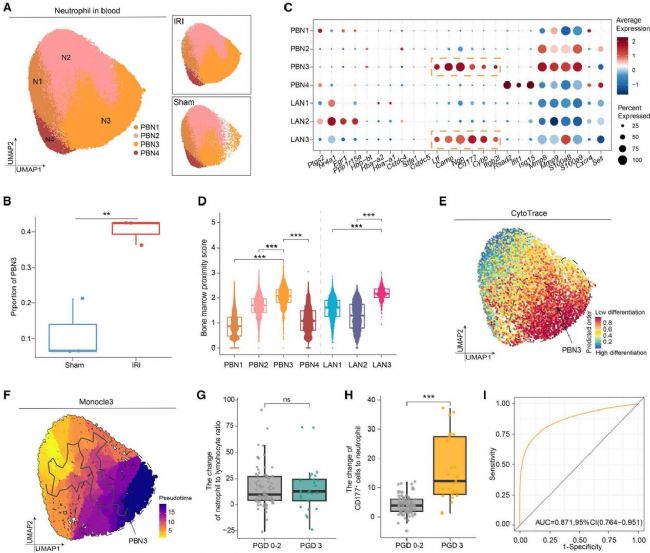 此外,研究人員評(píng)估了104名肺移植受者(LTRs)在移植前和移植后4小時(shí)的血液樣本,其中25人在移植后72小時(shí)內(nèi)發(fā)展為3級(jí)PGD。通過(guò)流式細(xì)胞術(shù)分析外周血中的CD177+中性粒細(xì)胞,發(fā)現(xiàn)移植后4小時(shí)內(nèi)CD177+中性粒細(xì)胞比例的變化(ΔCD177+中性粒細(xì)胞)可作為3級(jí)PGD的早期診斷指標(biāo)。與傳統(tǒng)的中性粒細(xì)胞與淋巴細(xì)胞比值(NLR)相比,ΔCD177+中性粒細(xì)胞在3級(jí)PGD組中顯著更高(圖3G-H),且具有更高的預(yù)測(cè)能力,邏輯回歸分析顯示其比值比為1.813,特征曲線分析也表明其具有出色的預(yù)測(cè)能力(AUC = 0.871)(圖3I)。