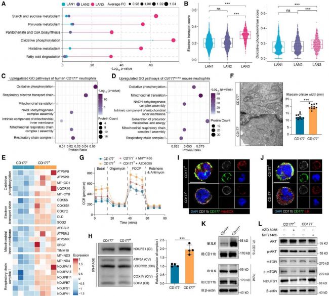 研究人員利用單細(xì)胞代謝組學(xué)技術(shù)(scMetabolism)評(píng)估小鼠中性粒細(xì)胞的代謝途徑活性,發(fā)現(xiàn)LAN3群體在氧化磷酸化(OXPHOS)和碳水化合物代謝方面顯著富集,表明線粒體OXPHOS是Cd177+中性粒細(xì)胞激活的基礎(chǔ)(圖4A-B)。蛋白質(zhì)組學(xué)分析顯示,人類和小鼠的CD177+中性粒細(xì)胞中多種蛋白質(zhì)表達(dá)升高,特別是與OXPHOS相關(guān)的通路(圖4C-D)。人類CD177+細(xì)胞中線粒體復(fù)合體I的核心亞基NDUFA11和NDUFS1水平顯著增加(圖4E)。透射電子顯微鏡和熒光染色揭示,CD177−細(xì)胞的線粒體嵴腔更窄,活性氧減少,而CD177+細(xì)胞的氧氣消耗率(OCR)更高(圖4F-4G)。PAGE和免疫印跡分析進(jìn)一步證實(shí)了CD177+細(xì)胞中NDUFS1表達(dá)的顯著增加(圖4H)。共聚焦顯微鏡觀察到,CD177與整合素αMβ2(MAC-1和CD11b/CD18)相互作用可增加線粒體活性氧(圖4I)。分析CD11b相互作用組發(fā)現(xiàn),ILK(整合素連接激酶)是關(guān)鍵因素,可能通過(guò)激活A(yù)KT/mTOR信號(hào)通路調(diào)節(jié)線粒體復(fù)合體I基因轉(zhuǎn)錄。共聚焦顯微鏡和共免疫沉淀實(shí)驗(yàn)顯示,CD177+細(xì)胞中CD11b與ILK的相互作用更強(qiáng)(圖4-K),且ILK與AKT存在顯著相互作用并伴隨AKT和mTOR的磷酸化(圖4L)。使用ILK、AKT和mTOR的抑制劑和激動(dòng)劑進(jìn)行實(shí)驗(yàn),結(jié)果表明ILK-AKT-mTOR軸是驅(qū)動(dòng)CD177+細(xì)胞中線粒體復(fù)合體I激活的關(guān)鍵途徑。抑制這些信號(hào)分子可降低CD177+細(xì)胞中NDUFS1的表達(dá)和OXPHOS活性,而激活則產(chǎn)生相反效果(圖4G-L)。這些結(jié)果揭示了CD177/MAC-1復(fù)合體通過(guò)ILK激活A(yù)KT/mTOR信號(hào)通路,促進(jìn)CD177+中性粒細(xì)胞中的OXPHOS。