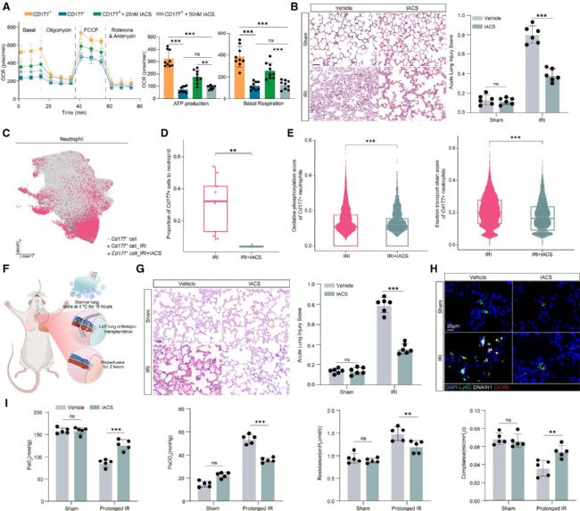 研究人員評(píng)估了線粒體復(fù)合體I抑制劑IACS對(duì)CD177+中性粒細(xì)胞的抗炎效果。結(jié)果顯示, 20和50 nmol/L 的IACS顯著降低了人類CD177+中性粒細(xì)胞的氧氣消耗率(OCR)(圖5A),并且降低了ROS、NET形成以及CAMP和LTF的表達(dá)。為評(píng)估靶向OXPHOS是否能有效減輕肺IRI,C57BL/6小鼠在手術(shù)前3小時(shí)通過(guò)靜脈注射接受了1 mg/kg 的IACS,結(jié)果表明,IACS處理顯著減輕了肺損傷評(píng)分(圖5B)。為確認(rèn)系統(tǒng)性IACS給藥會(huì)影響體內(nèi)中性粒細(xì)胞的線粒體功能,研究人員對(duì)IACS處理和未處理IRI肺的中性粒細(xì)胞進(jìn)行了scRNA-seq測(cè)序。經(jīng)過(guò)質(zhì)量控制和數(shù)據(jù)整合后,研究人員獲得了11,150個(gè)Cd177+細(xì)胞(IACS組:2,363個(gè),對(duì)照組:8,787個(gè);圖5C)。IACS處理組中Cd177+細(xì)胞的比例顯著降低(圖5D),且OXPHOS、ETC和脫顆粒相關(guān)基因評(píng)分均有所降低(圖5E)。表明IACS可以在體內(nèi)外抑制Cd177+中性粒細(xì)胞的激活。此外,研究人員采用原位左肺移植大鼠模型來(lái)模擬長(zhǎng)時(shí)間冷缺血再灌注損傷。左供肺在4℃下保存18小時(shí)后移植,再灌注2小時(shí)后取出移植肺(圖5F)。接受IACS治療的受體大鼠顯示出損傷減輕和肺泡結(jié)構(gòu)得以保留(圖5G),且浸潤(rùn)性中性粒細(xì)胞和NETs更少(圖5H)。IACS還保護(hù)肺部免受再灌注后肺水腫的影響,改善肺順應(yīng)性,降低阻力,并增強(qiáng)氧合(圖5I)。這些結(jié)果表明,通過(guò)抑制線粒體復(fù)合體I來(lái)靶向氧化磷酸化是一種緩解肺缺血再灌注損傷的可行治療策略。