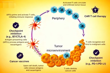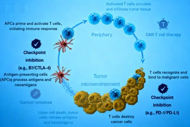 圖1展示了腫瘤免疫學(xué)研究的關(guān)鍵方向,包括免疫檢查點抑制劑、CAR-T細(xì)胞治療及腫瘤疫苗等在適應(yīng)性免疫反應(yīng)各階段的作用機制。