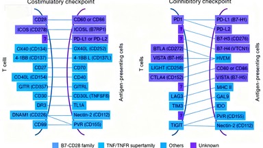 圖2展示了APC與T細(xì)胞間復(fù)雜的受體-配體相互作用網(wǎng)絡(luò),其中B7-CD28家族(紫色標(biāo)注)和TNF超家族(綠色標(biāo)注)是調(diào)控T細(xì)胞活化的關(guān)鍵分子家族。