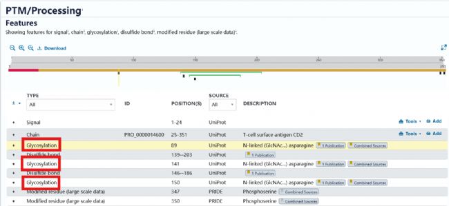 ● 翻譯后修飾:如糖基化,常見接受糖基化的氨基酸是絲氨酸(Ser)、蘇氨酸(Thr)、天冬酰胺(Asn)和羥賴氨酸(Hydroxylysine),例如CD2,根據(jù)uniprot顯示,其預(yù)測分子量應(yīng)該在39kda左右,但是表觀分子量一般在45kDa左右,這是由于CD2多個位點存在糖基化修飾,實際實驗中,如果想探究分子量差異是否是由糖基化引起的,可以加入糖苷酶PNGase F切去糖基后,進行WB,而除了糖基化以外,還存在磷酸化,泛素化、甲基化、乙酰化等多種翻譯后修飾。其中,糖基化、乙;、甲基化通常是使表觀分子量變大,磷酸化通常不變或變大。