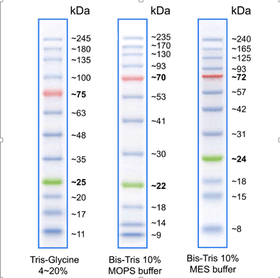 和非預(yù)染marker相比,預(yù)染marker雖然使用更加方便,但是由于偶聯(lián)了染料,也存在分子量偏移的現(xiàn)象,并且同一個marker在不同的電泳體系中,遷移速度也會有所偏差。