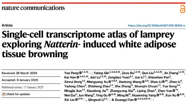 Pang Y, Qin Y, Du Z, Liu Q, Zhang J, Han K, Lu J, Yuan Z, Li J, Pan S, Dong X, Xu M, Wang D, Li S, Li Z, Chen Y, Zhao Z, Zhang Z, Chuan S, Song Y, Sun M, Jia X, Xia Z, Zhan L, Yue Z, Cui W, Wang J, Gu Y, Ni M, Yang H, Xu X, Liu X, Li Q, Fan G. Single-cell transcriptome atlas of lamprey exploring Natterin- induced white adipose tissue browning. Nat Commun. 2025 Jan 17;16(1):752. doi: 10.1038/s41467-025-56153-w. PMID: 39820434; PMCID: PMC11739602.