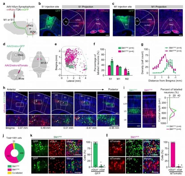 研究人員首先在S1和M1分別注射了AAV-hSyn-Synaptophysin-mRuby,發(fā)現(xiàn)在PAG和RVM均有S1與M1來源的軸突末梢分布;在PAG和RVM分別注射逆行病毒,結(jié)果顯示PAG投射神經(jīng)元和RVM投射神經(jīng)元主要分布于S1、M1及M2區(qū)域,尤其集中在S1和M1皮層,分別為SM1PAG神經(jīng)元和SM1RVM神經(jīng)元;結(jié)合CTB逆行示蹤結(jié)果,表明SM1PAG和SM1RVM是兩個解剖上分離的谷氨酸能神經(jīng)元亞群。通過全細(xì)胞膜片鉗技術(shù)發(fā)現(xiàn),SM1PAG和SM1RVM具有完全不同的電生理特性。