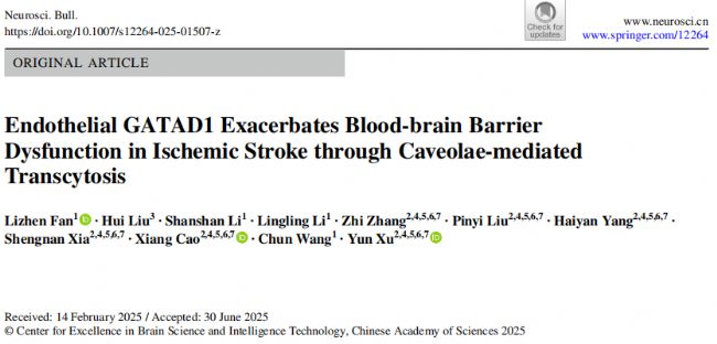 Fan L, Liu H, Li S, et al. Endothelial GATAD1 Exacerbates Blood-brain Barrier Dysfunction in Ischemic Stroke through Caveolae-mediated Transcytosis. Neurosci Bull. Published online September 18, 2025. doi:10.1007/s12264-025-01507-z