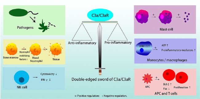 C3a/C3aR1在免疫調(diào)節(jié)中扮演著“雙刃劍”的角色,通過(guò)精準(zhǔn)調(diào)控固有免疫細(xì)胞(如中性粒細(xì)胞、NK細(xì)胞、單核/巨噬細(xì)胞、肥大細(xì)胞)及適應(yīng)性免疫細(xì)胞(T細(xì)胞)的功能,在免疫應(yīng)答中發(fā)揮雙向調(diào)控作用,兼具抗炎與促炎雙重功能。具體表現(xiàn)如圖: