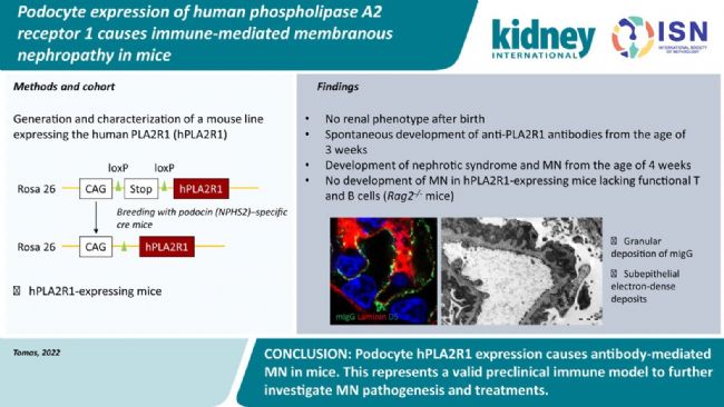 然而,小鼠和大鼠的腎小球足細(xì)胞不表達(dá)PLA2R1,因此缺乏能模擬人類PLA2R1相關(guān)MN的動(dòng)物模型。2019年~2023年,Gunther Zahner及其團(tuán)隊(duì)發(fā)表過一系列研究,通過在足細(xì)胞過表達(dá)PLA2R1抗原,構(gòu)建了三種基于PLA2R1抗體的膜性腎病小鼠模型。