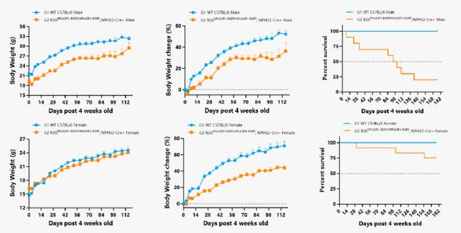 圖5. R26-CAG-LSL-hPLA2R1-IRES-EGFP; NPHS2-Cre小鼠體重和存活率結(jié)果。足細(xì)胞特異性過表達(dá)人源PLA2R1的小鼠體重增長減緩,死亡率升高。
