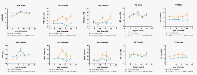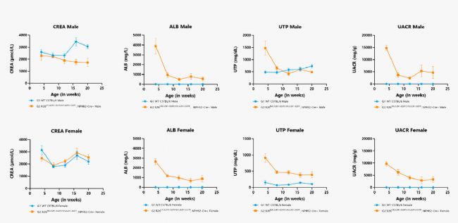 圖7. R26-CAG-LSL-hPLA2R1-IRES-EGFP; NPHS2-Cre小鼠血生化結(jié)果。足細(xì)胞特異性過表達(dá)人源PLA2R1的小鼠從4/6周齡開始出現(xiàn)血液生化指標(biāo)異常(n=7/group)。