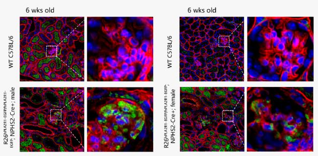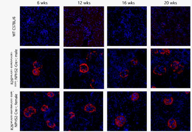 研究人員構(gòu)建了Rosa26-CAG-Stop-hPLA2R1(Balb/c)小鼠,通過與NPHS2-Cre小鼠交配,實(shí)現(xiàn)足細(xì)胞特異性表達(dá)人PLA2R1模型[4]。